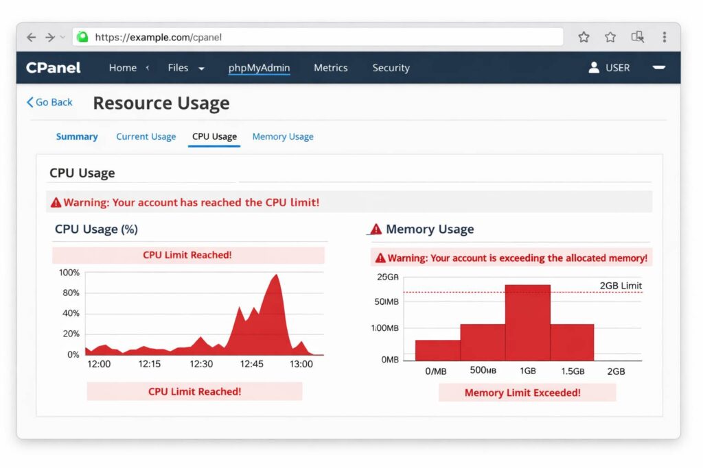 Buka cPanel -> Metrics -> Resource Usage atau CPU Usage. Lihat grafik: